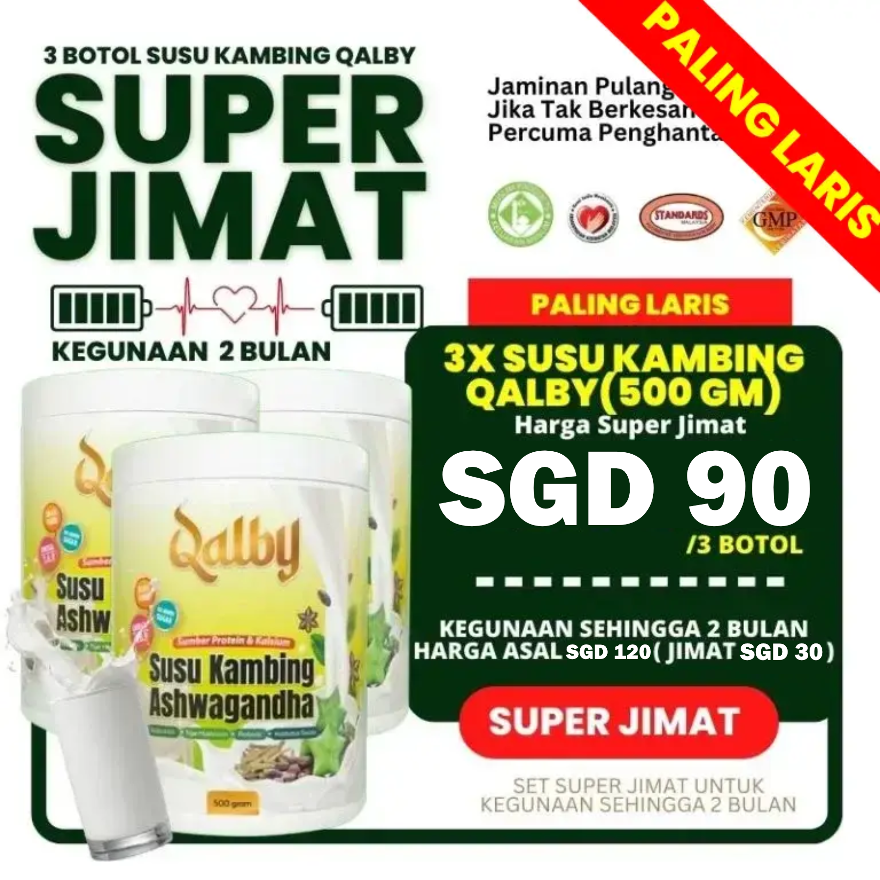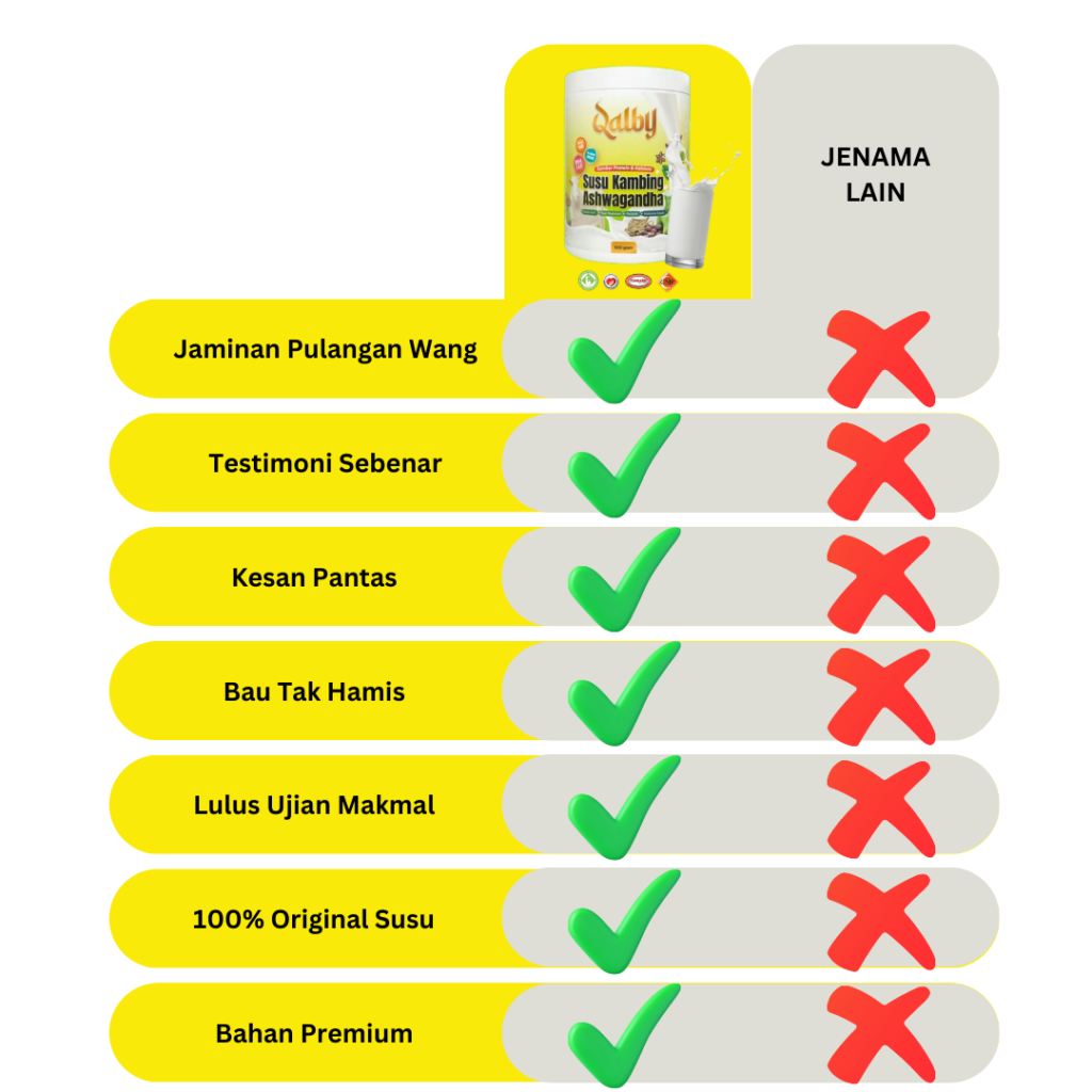 Hati-hati dengan produk SUSU KAMBING yang dijual lebih murah di luar. SUSU KAMBING QALBY kami ada pengiktirafan khas dari MeSTI dan dihasilkan dari Kilang bertaraf GMP.